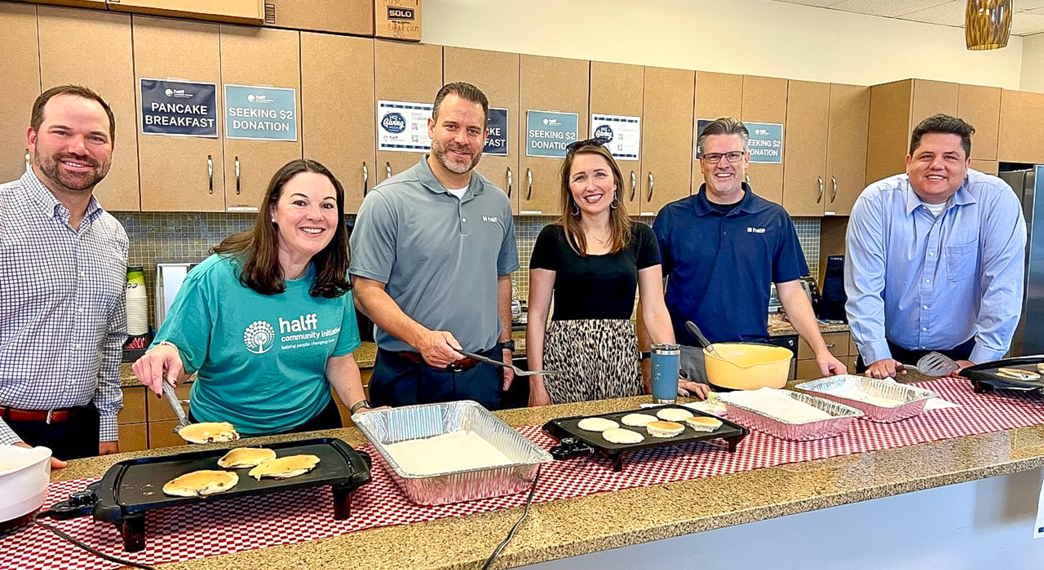 From left to right: Ben Pylant, Jessica Baker Daily, Dan Warfield, Melanie Cleavelin, Keith Courson and Joseph Sagel. Together they hosted a pancake breakfast for the Richardson office to raise HCI donations during HCI Giving Week in 2023.