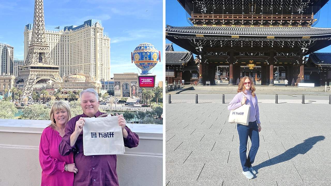 Jena Becker (right) traveled with her Halff bag to Japan, where she visited Kyoto and snapped a photo at the Higashi Hongan-ji Temple.