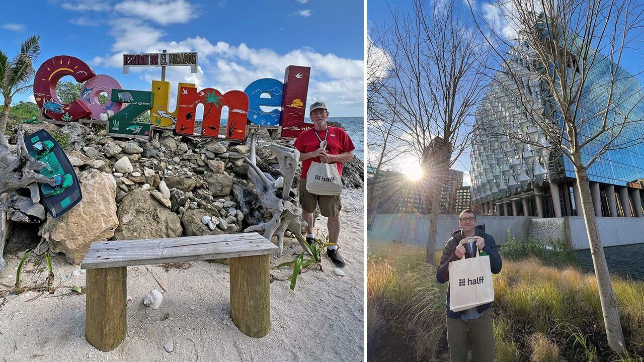 Steven Fensterer (left) and his Halff bag soaked up the sun on the beaches of Cozumel, Mexico.