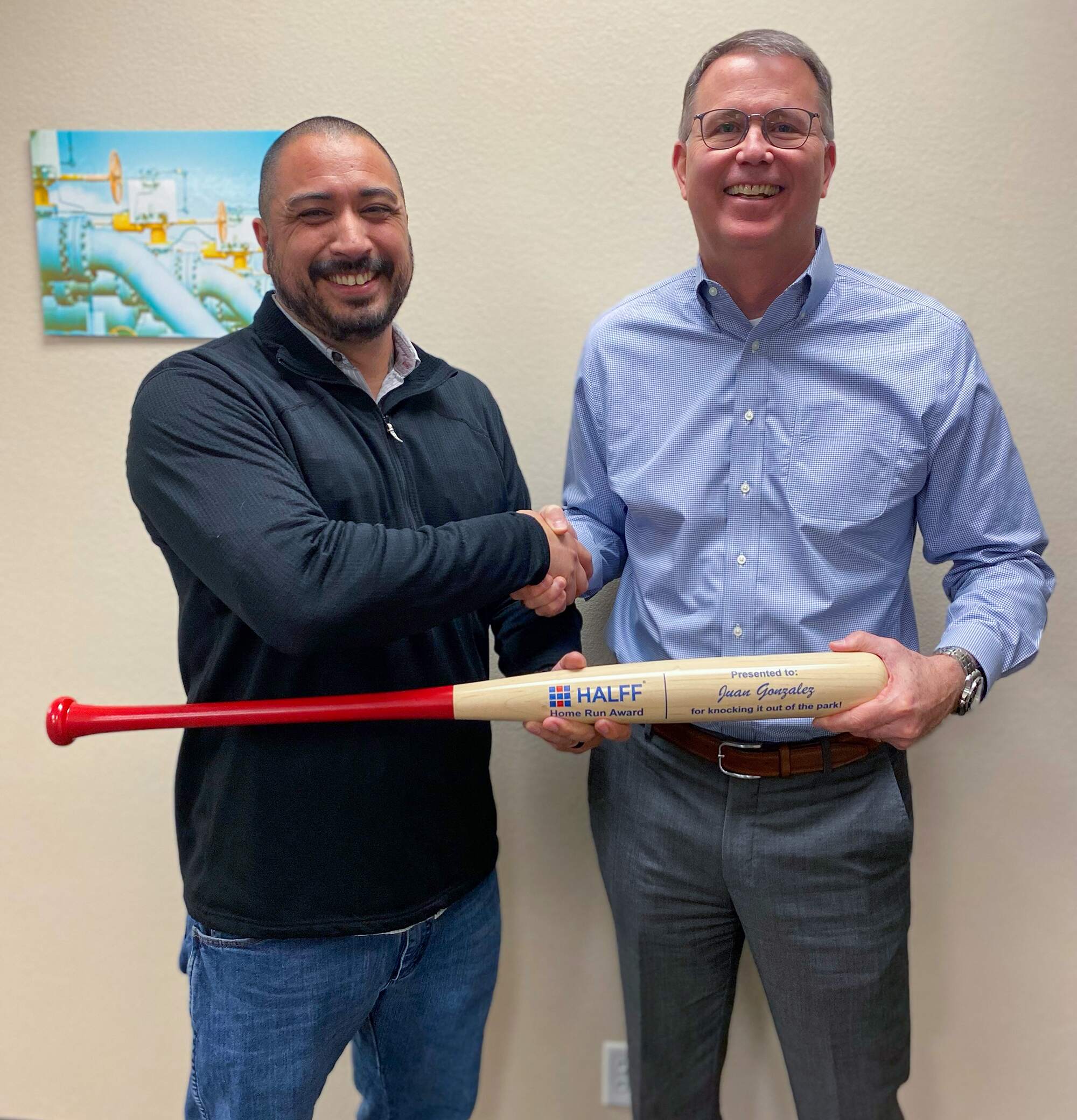 President/CEO Mark Edwards awarded Survey Team Leader Juan Gonzalez with the Halff Home Run Award.