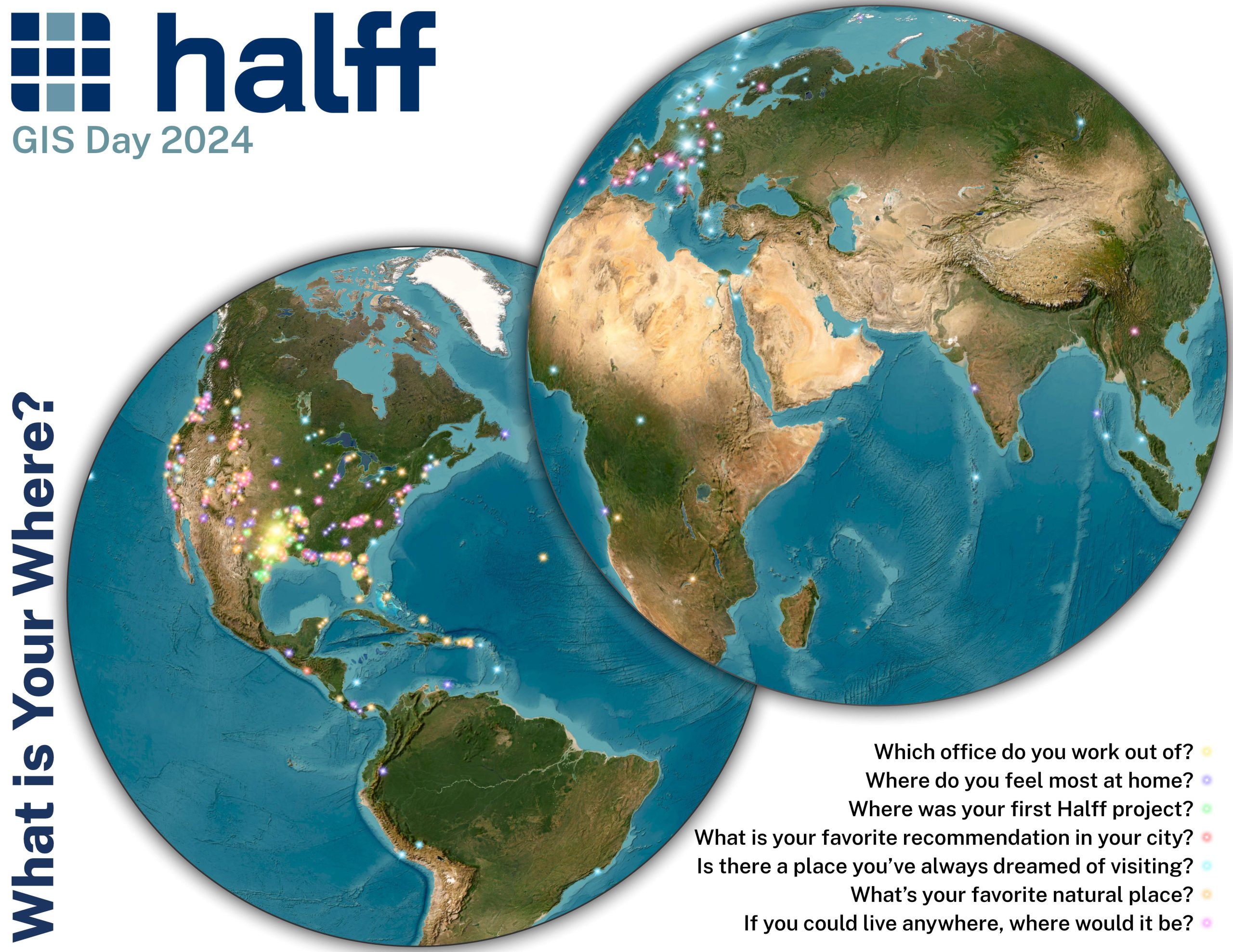 Our GIS team surveyed more than 150 Halff employees to see “what is their where” on the map. The result is a beautiful mosaic highlighting the places that have shaped their personal and professional lives.