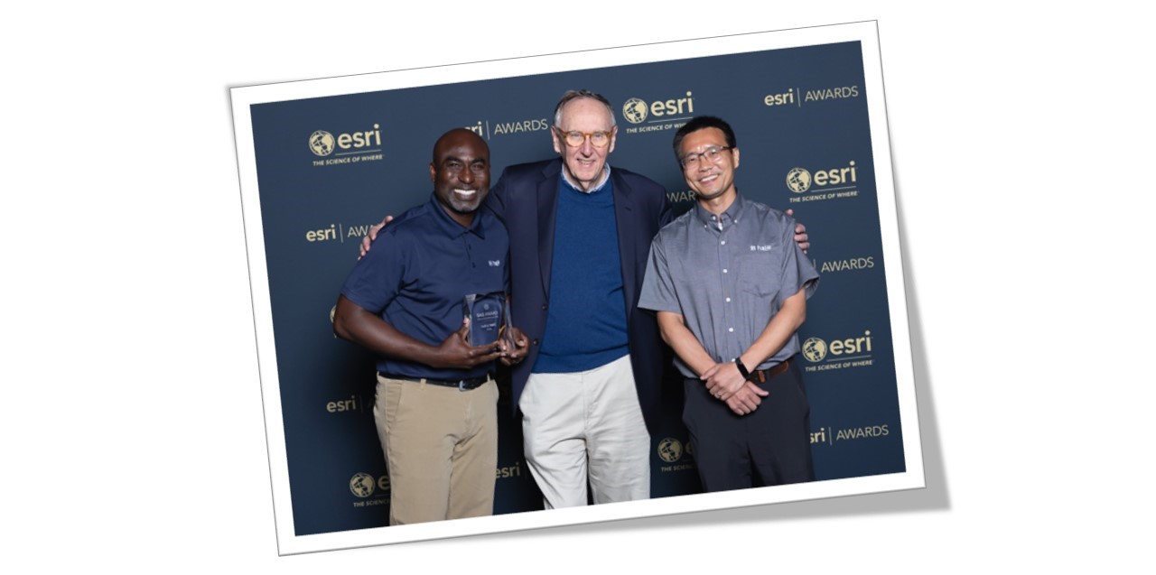 Fun Fact! Earlier this year, Halff was honored with an Esri Special Achievement in GIS Award, where Halff’s GIS professionals Sam (left) and Zongpei (right) got to accept the award from Jack Dangermond.