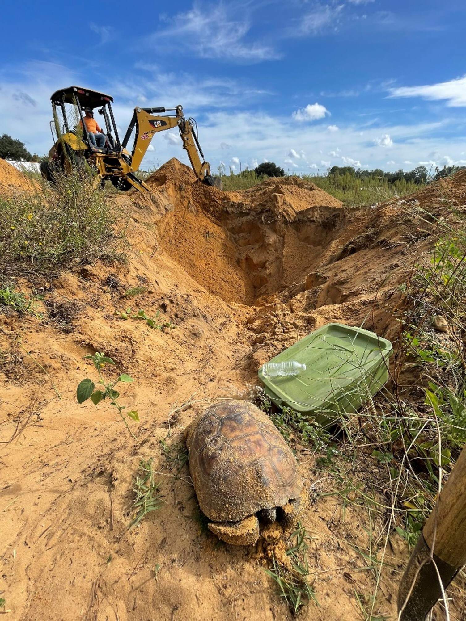 Tortoises dig burrows and shelter below ground. To relocate the gopher tortoises, excavation holes are created to quickly capture and move them in the most cost-effective way — away from development areas. Depending on the soil type and water table, the excavation holes can get quite large and deep.