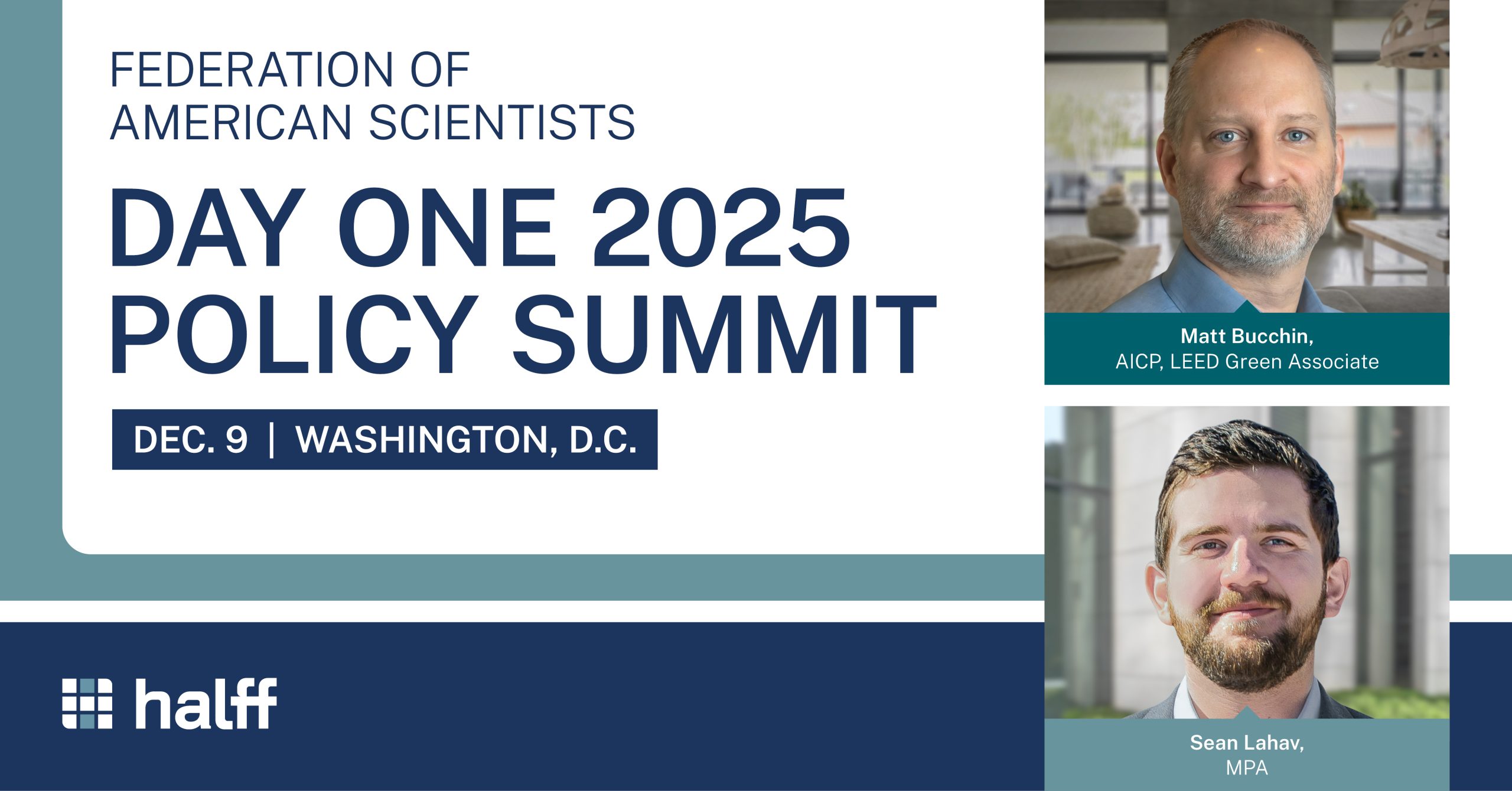 RICHARDSON, Texas — Halff Placemaking Solutions Leader Matt Bucchin and Resilience Market Leader Sean Lahav have been appointed by the Federation of American Scientists (FAS) to author a Day One 2025 Policy Memo on Enhancing Planning for a Climate Resilient Infrastructure.