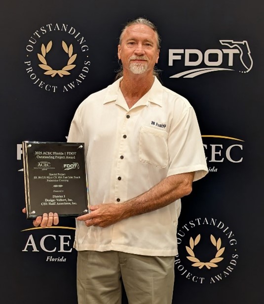 Halff Project Administrator Doug Pritchard was on site to receive the award at the June 6 Conference in Orlando, Florida, on behalf of Halff’s Crestview CEI team, which includes Trae Hurst, Robbin Moody, Michael Graham and Christian Ashton.