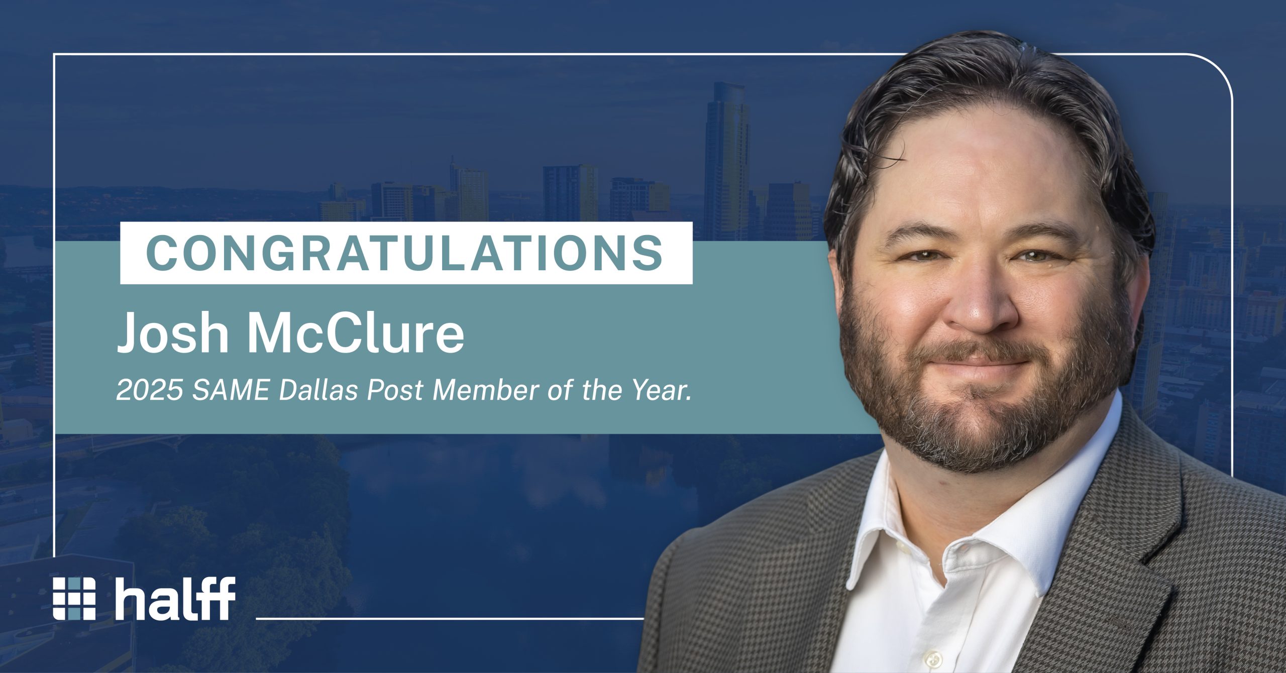 RICHARDSON, Texas — Halff Program Manager Josh McClure, PhD, PE, CFM, PMP, was recently named the 2025 Member of the Year by the Society of American Military Engineers (SAME) Dallas Post.