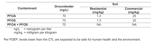 The Florida Department of Environmental Protection (FDEP) is the state’s lead agency for environmental management of Florida’s air, water, and land. As per Florida Administrative Code, Chapter 62-780, FDEP developed provisional cleanup target levels (CTLs) for PFOA and PFOS in groundwater and soil: