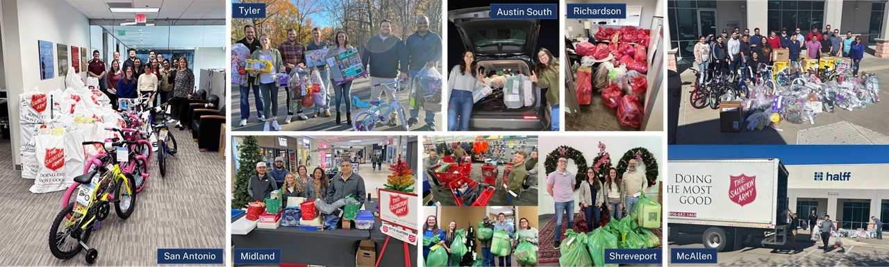 All Halff offices and teams celebrated the holiday season with special Christmas party dinners, themed activities, outings and more! View the collage below for a featured handful of the festivities and fun.