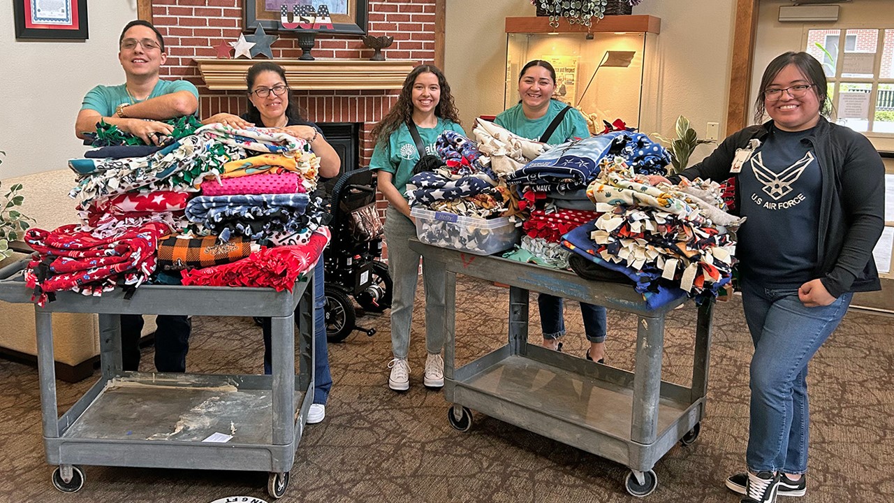 Volunteers from the McAllen office delivered no sew fleece blankets that they made over the summer to the Veterans Facility.