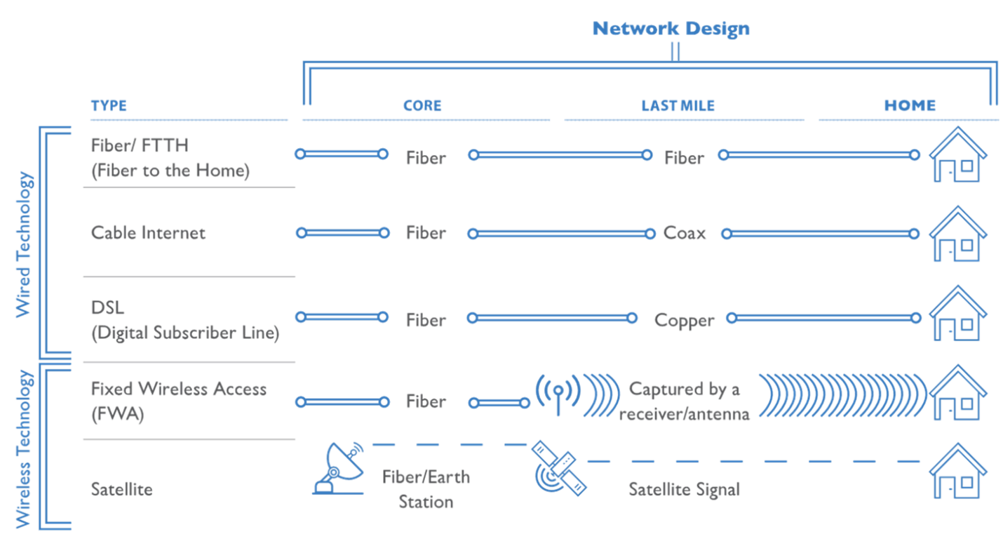 Even though several technologies exist, fiber is by far the most prominent moving forward. Copper lines (DSL) were created early in the industry and only provided phone lines and limited internet access speed. These technologies are now becoming obsolete.