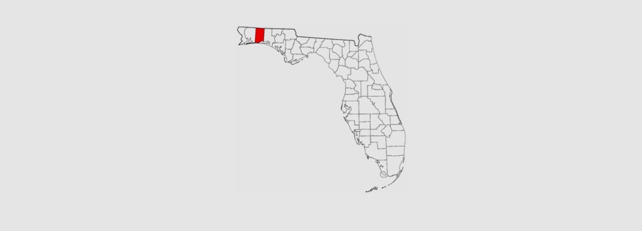 Okaloosa County (red) is located in the northwestern panhandle of Florida. A few cities located here include Crestview, Destin and Fort Walton Beach.